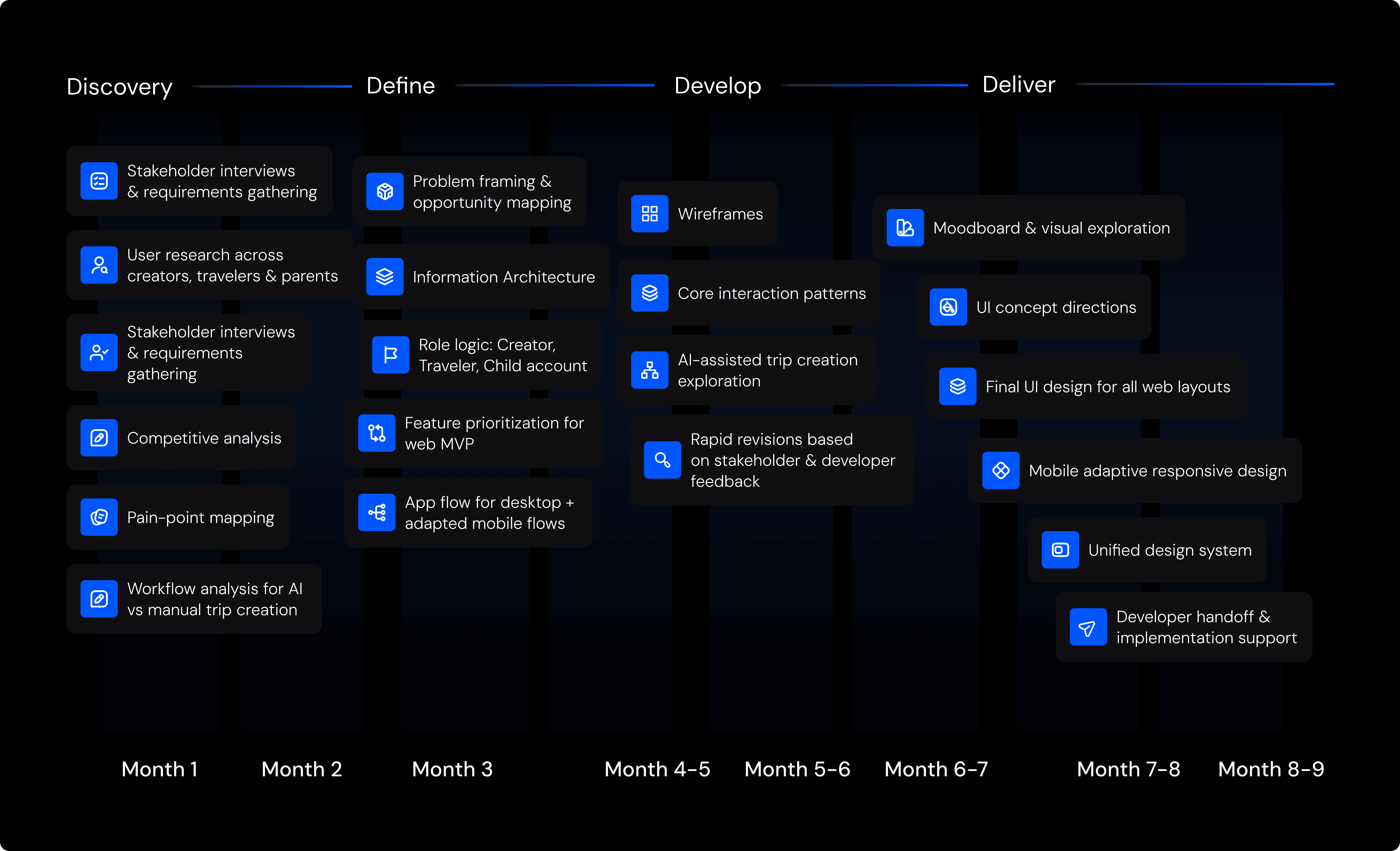 The 8-9 month design process moved from research to a fully validated web MVP — ensuring every decision was user-centered, technically feasible, and aligned with real group-travel behaviors. The result is a scalable foundation ready for mobile expansion and deeper AI-powered features.