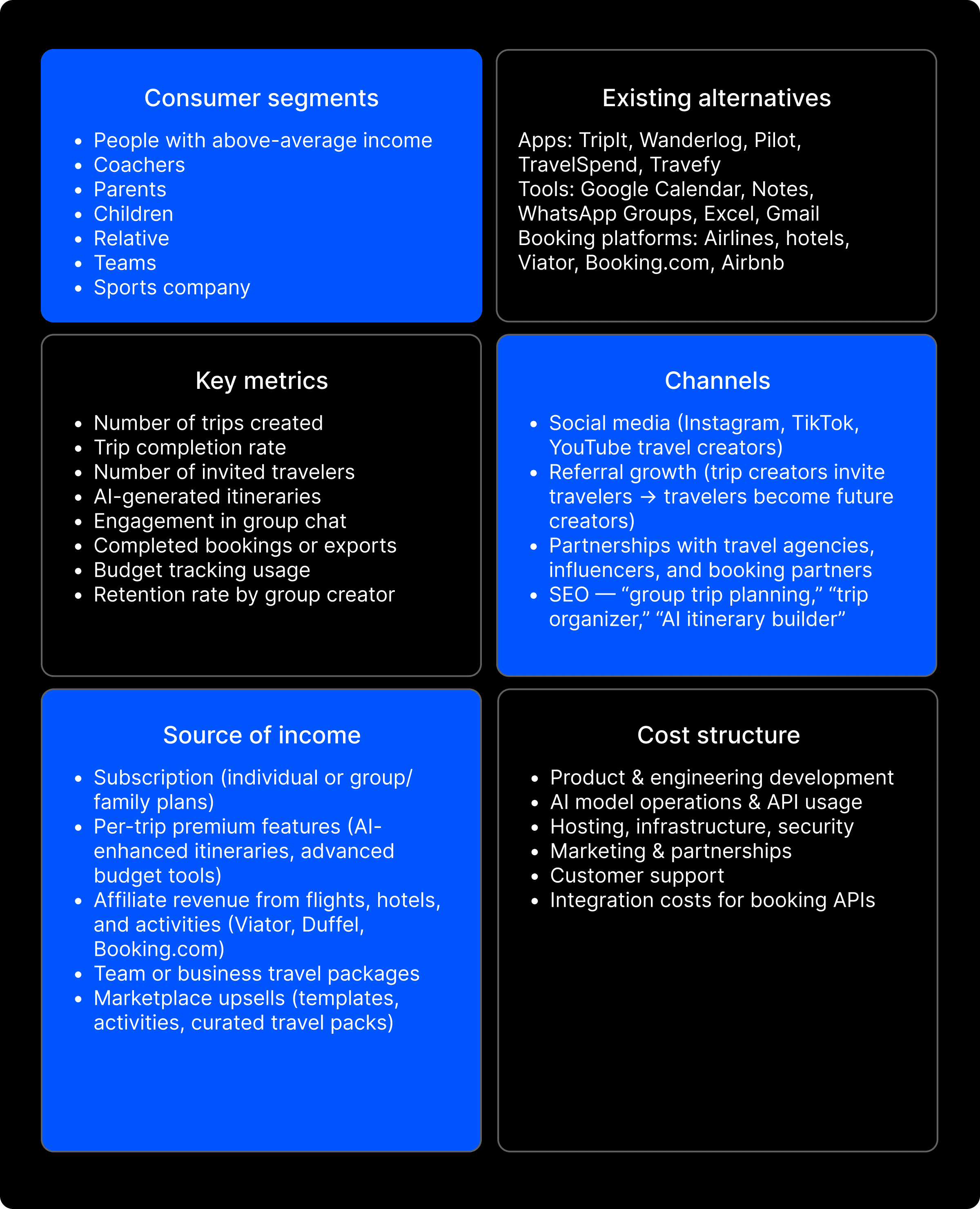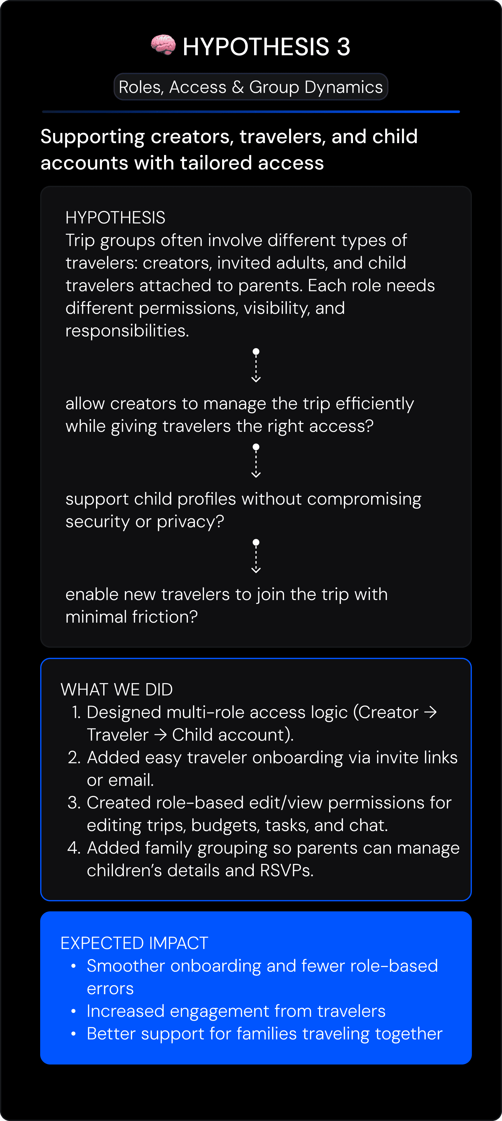 This helped clarify what mattered most for the MVP: enabling intuitive group trip planning, centralizing communication, supporting multi-role travel coordination, and introducing AI to streamline trip creation.