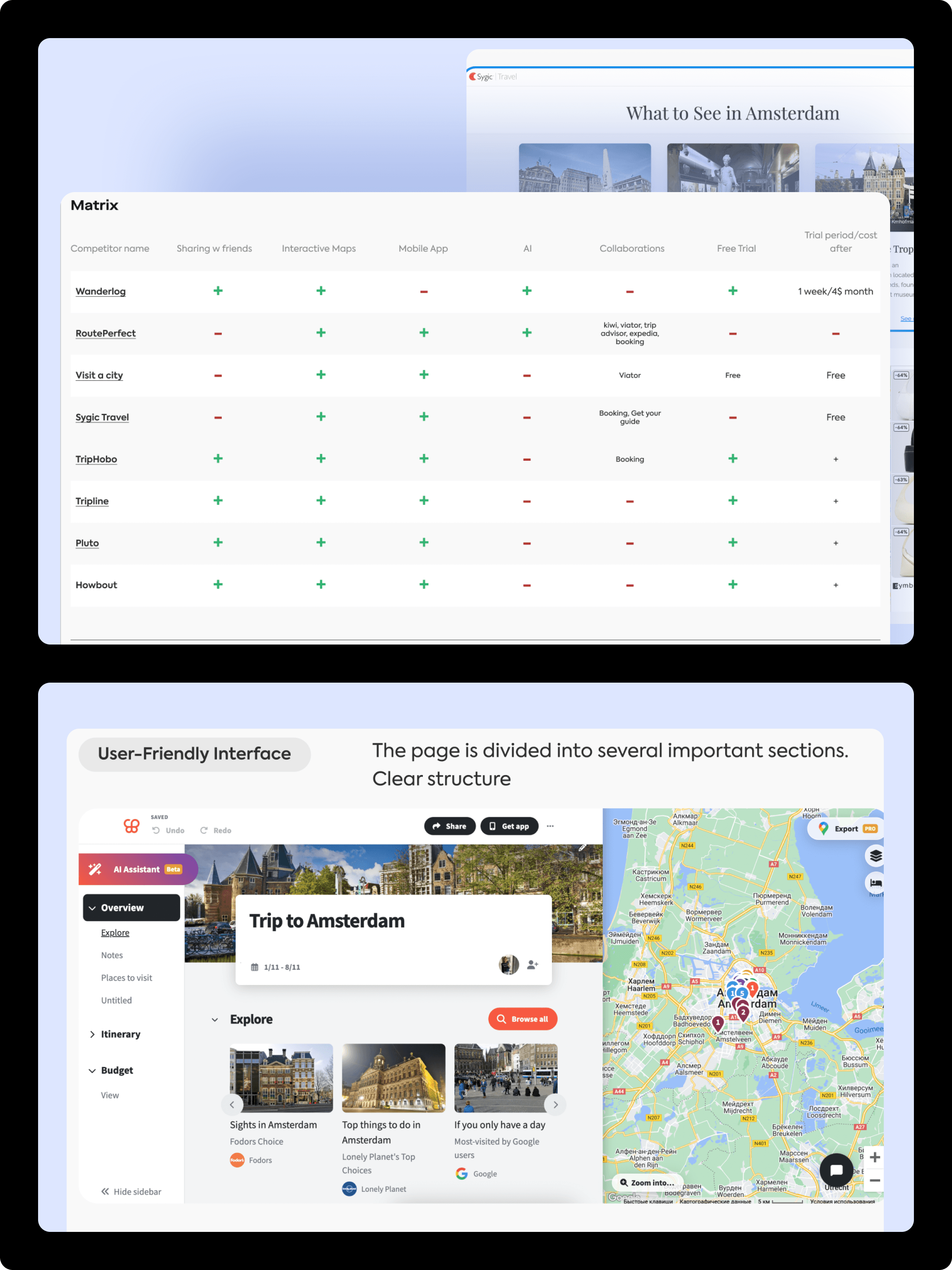 Through user interviews, competitor analysis, and workflow studies (AI vs manual planning), we identified the core pain points and opportunities for a unified trip-management experience