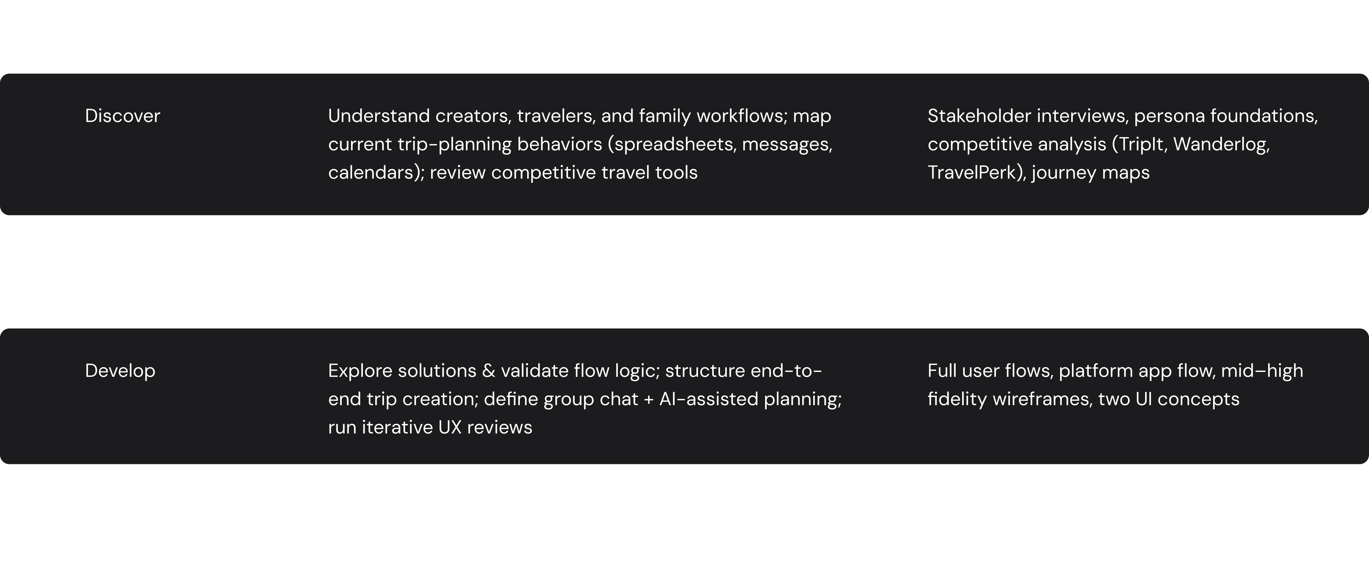 Using Double Diamond, Lean UX, and continuous validation, we defined a unified web platform where travel creators can build and manage trips end-to-end, invite friends and family, coordinate flights and hotels, track expenses, schedule activities, and communicate together — with AI support for fast trip creation.