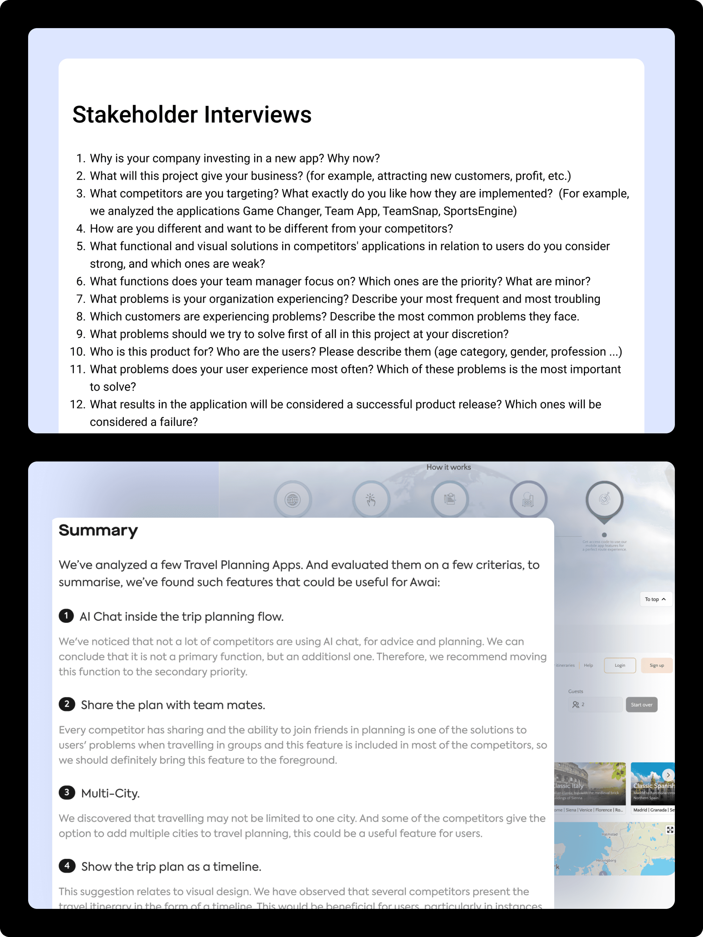 Our competitor research highlighted major gaps in group coordination, AI-powered planning, multi-city flexibility, budgeting, and intuitive trip visualization. These insights positioned Awai to deliver a more intelligent, collaborative, and end-to-end trip-management experience than existing tools — especially for family and group travel.