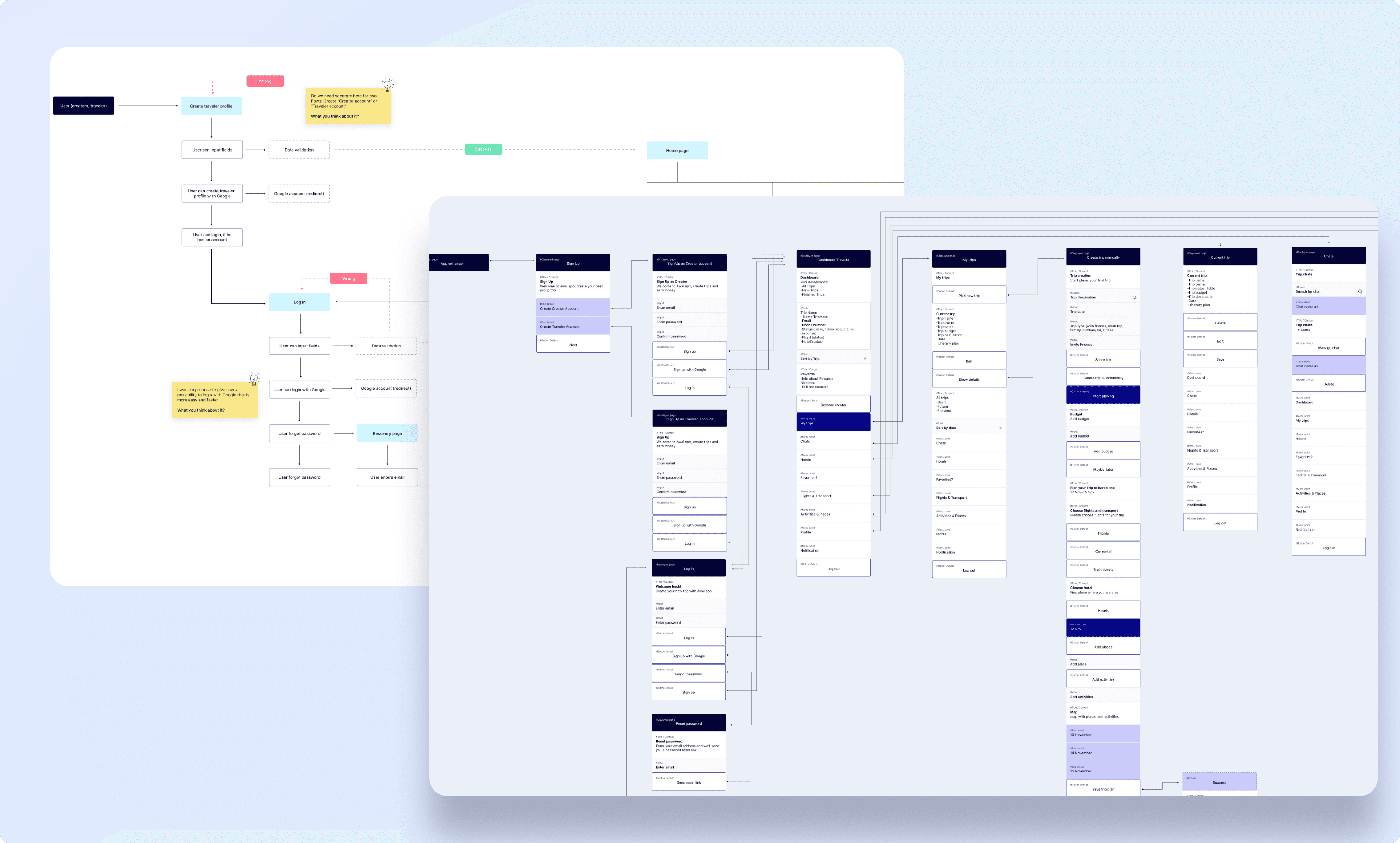 Validation ran continuously across flows, prototypes, and UI concepts, helping refine navigation, trip-creation logic, budgeting, and collaboration features.