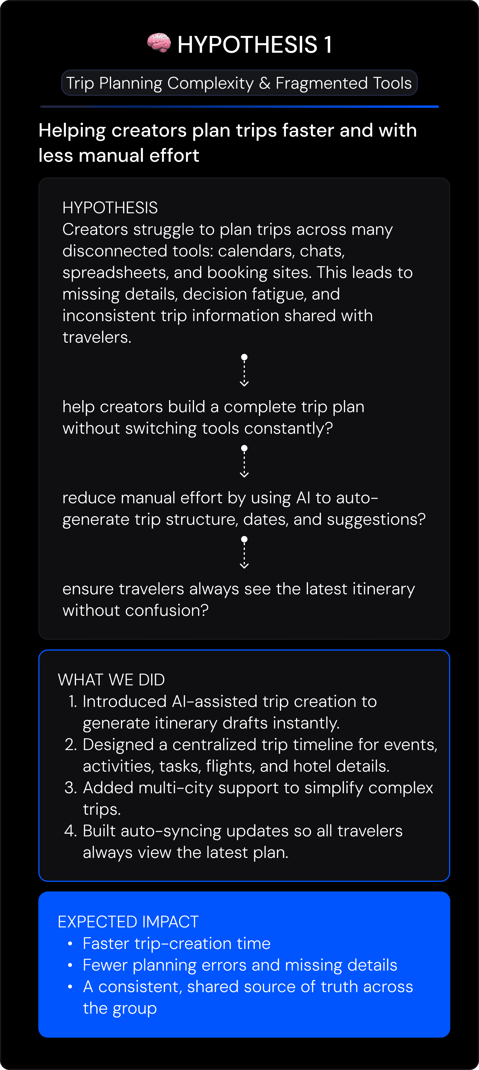The Discovery phase established a clear understanding of how creators, travelers, and families plan group trips today. Scattered tools — spreadsheets, chats, documents, and separate booking platforms — created confusion, lost details, and heavy coordination work for trip creators.