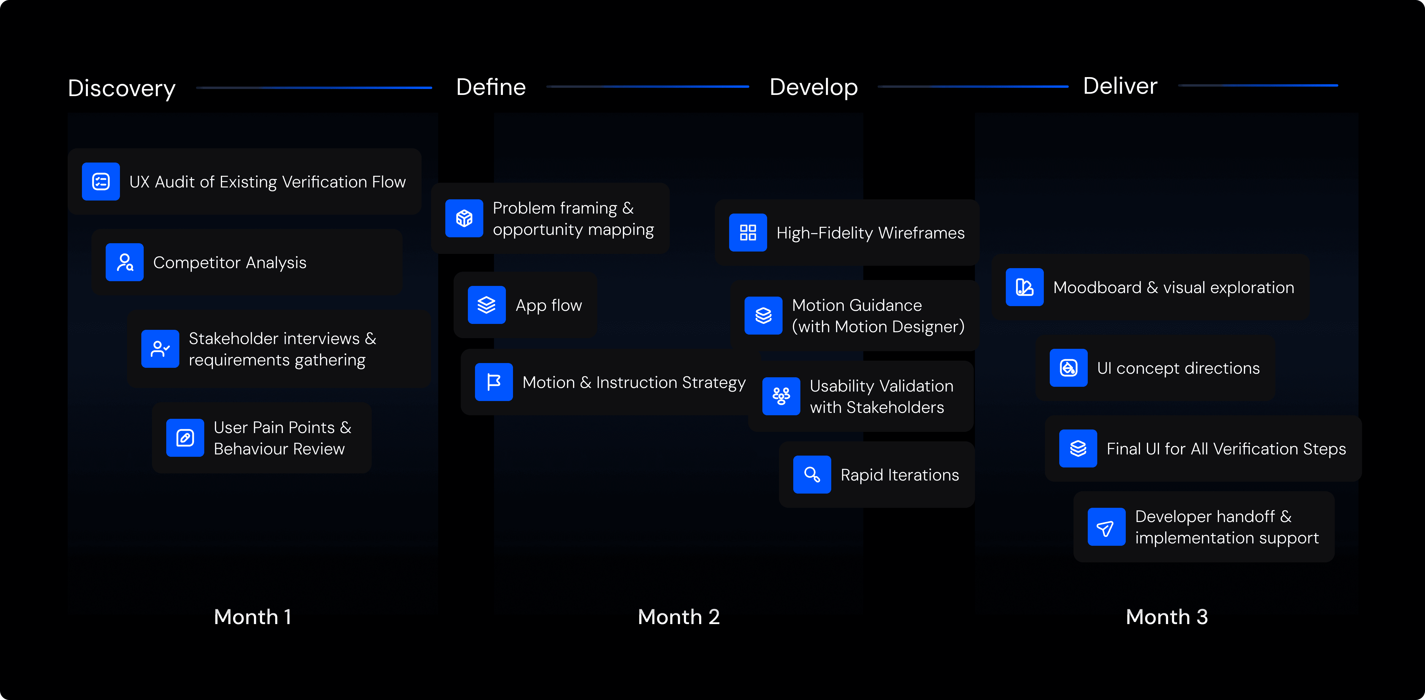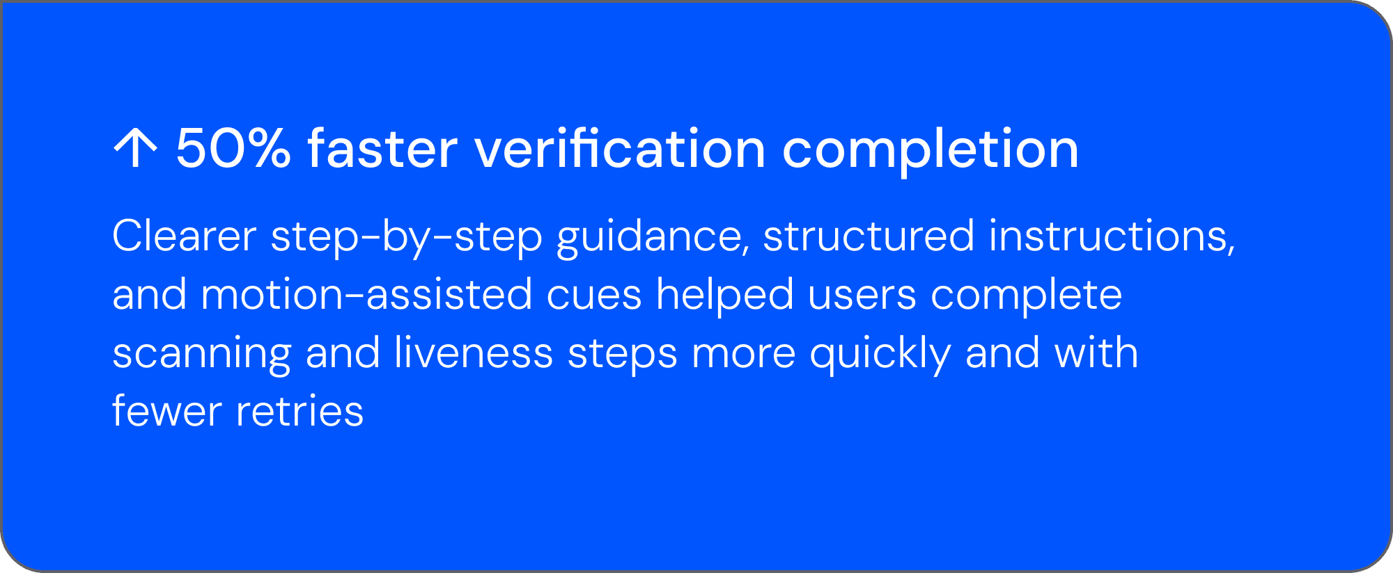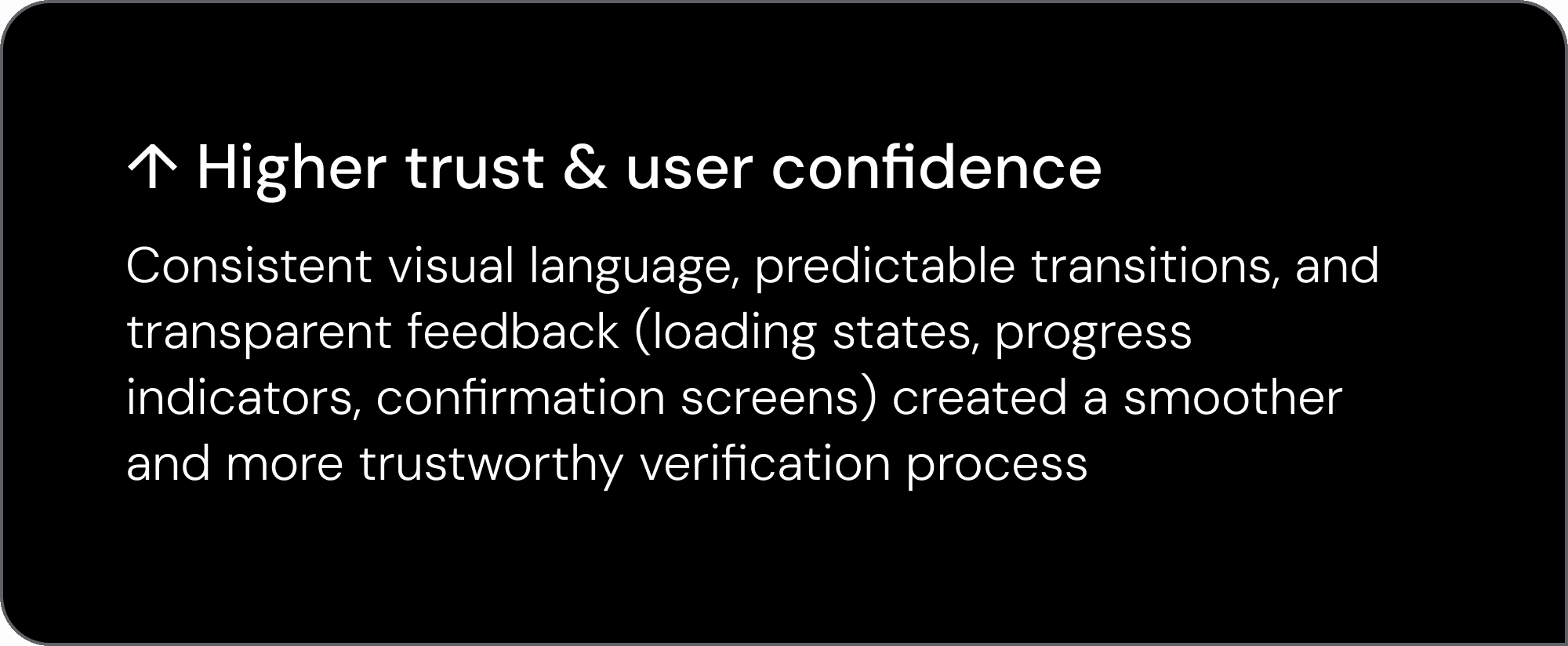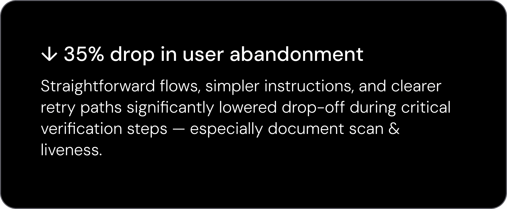 The collaborative process resulted in an onboarding flow that is intuitive, technically reliable, and easily embeddable — dramatically improving the end-user experience while reducing drop-off across verification steps.
