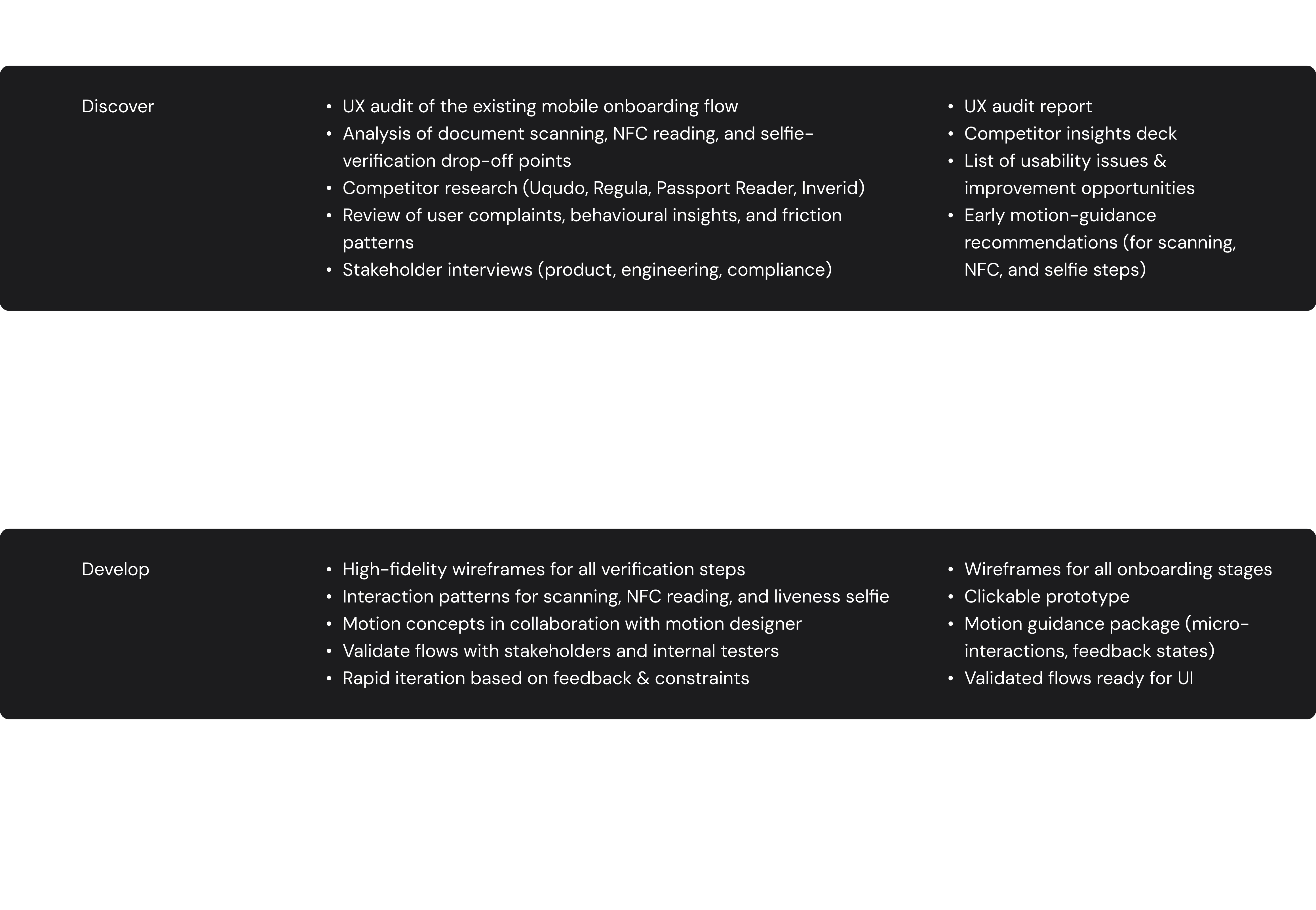 Each step — from early journey maps to motion-assisted prototypes — was tested against real onboarding constraints, device limitations (NFC, camera permissions), and behavioural insights from similar ID-verification products.