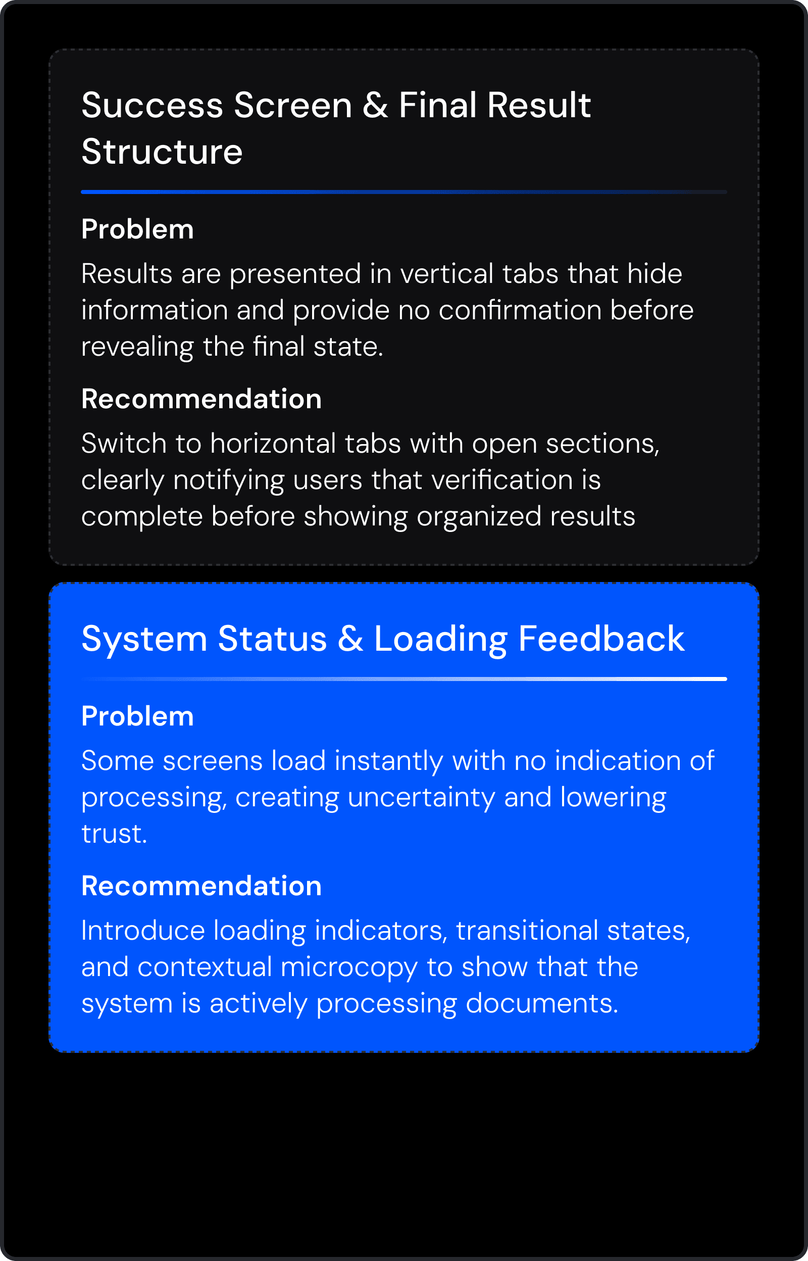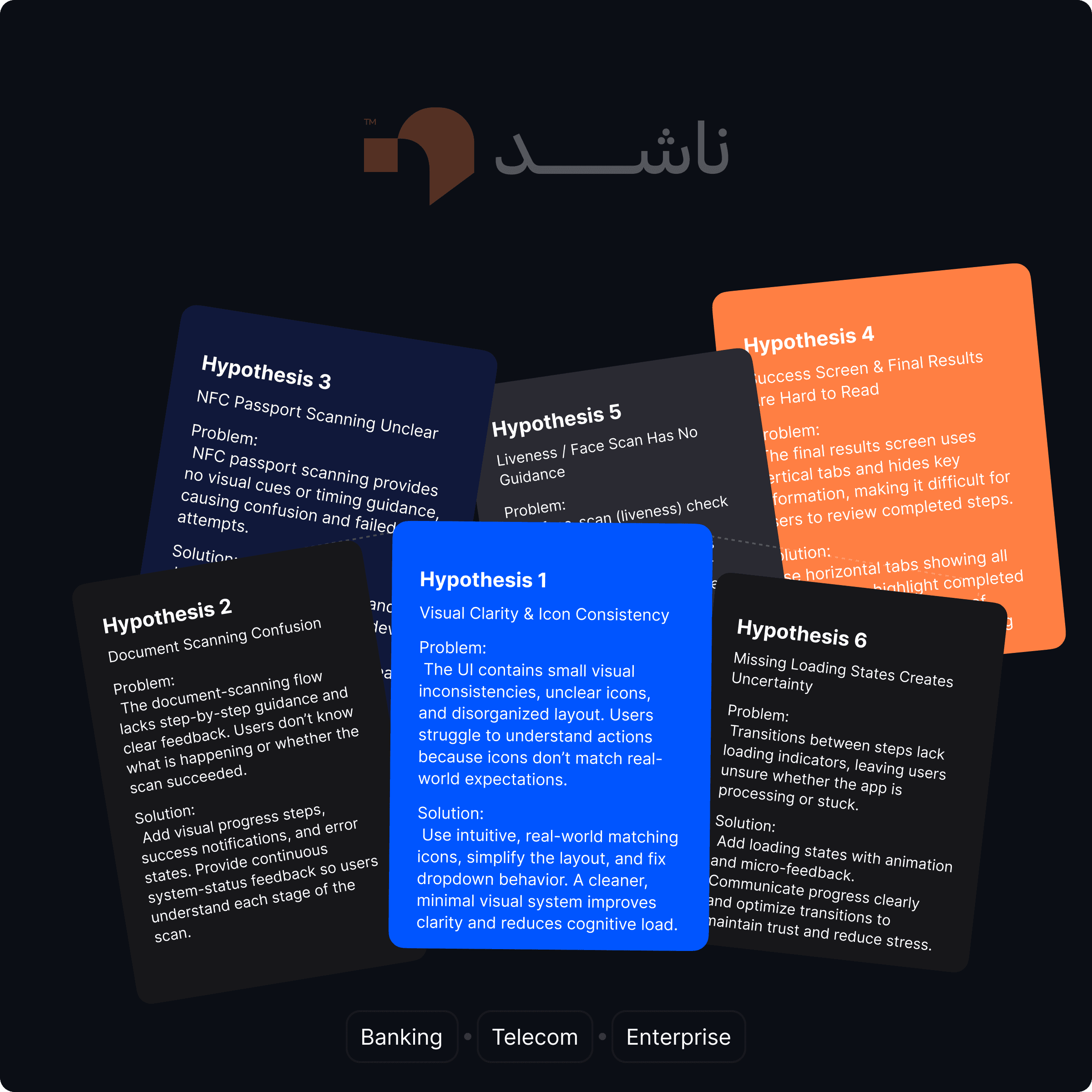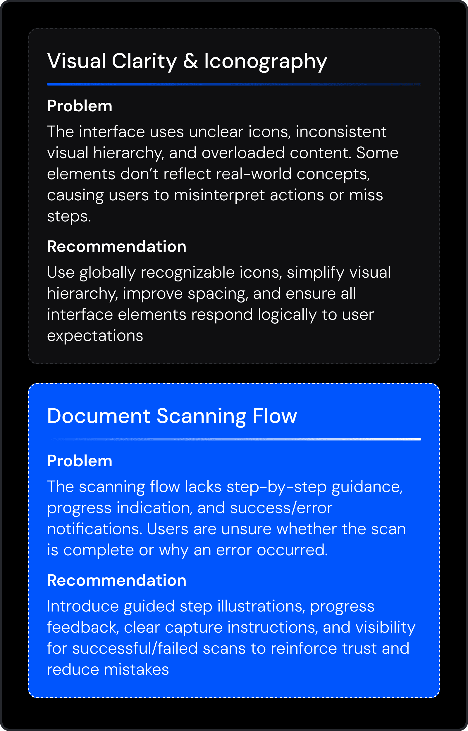 Our UX audit revealed several critical usability gaps across document scanning, NFC passport reading, liveness detection, system status visibility, and final result presentation. These issues affect user confidence, increase error rates, and disrupt the onboarding flow.